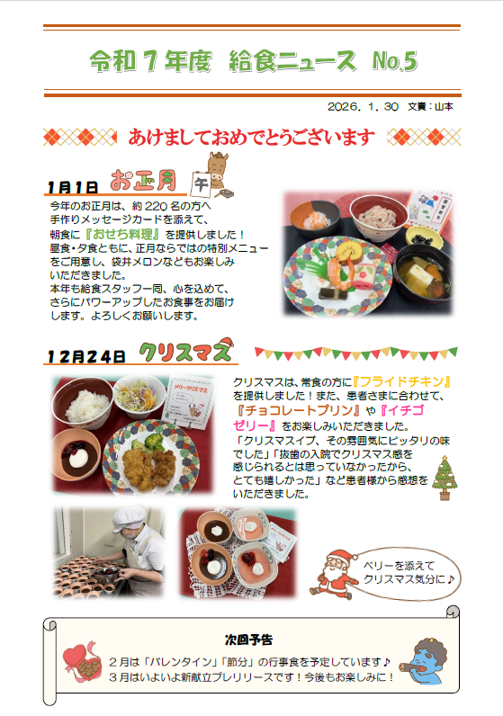 行事食や嗜好調査など最新情報をまとめた「給食ニュース」を発行しています 。