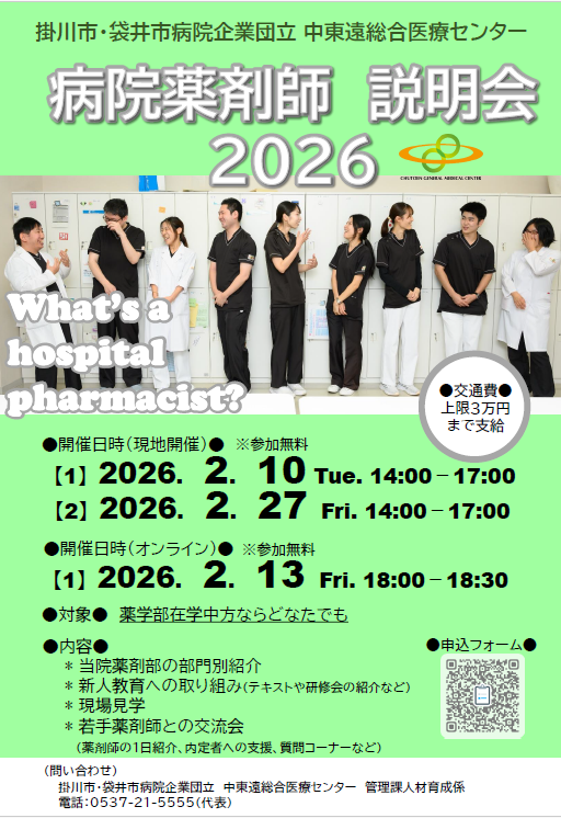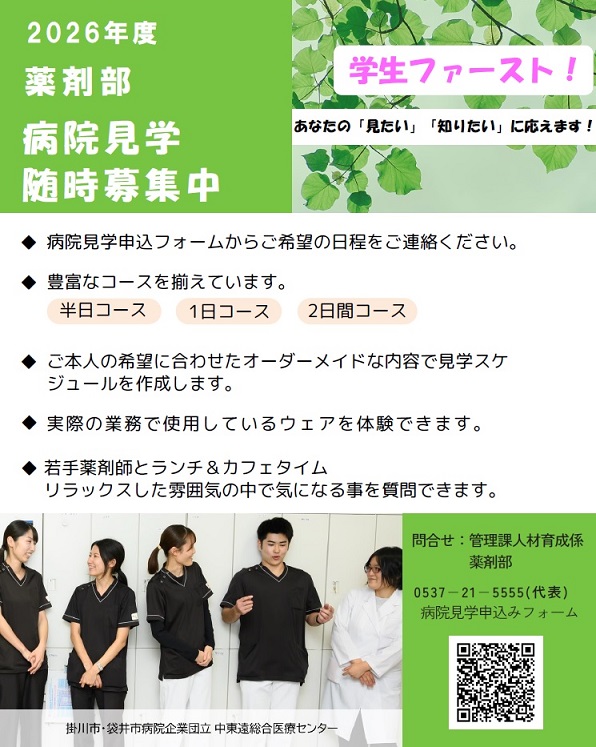 調剤室、注射調剤室、外来化学療法室、病棟など、各部署の見学と、業務内容についてご説明します。見学時間は半日から2日間まで見学者の要望や都合に合わせて調整します。また中東遠地区以外からの学生の見学者には交通費を支給します!(上限3万円)