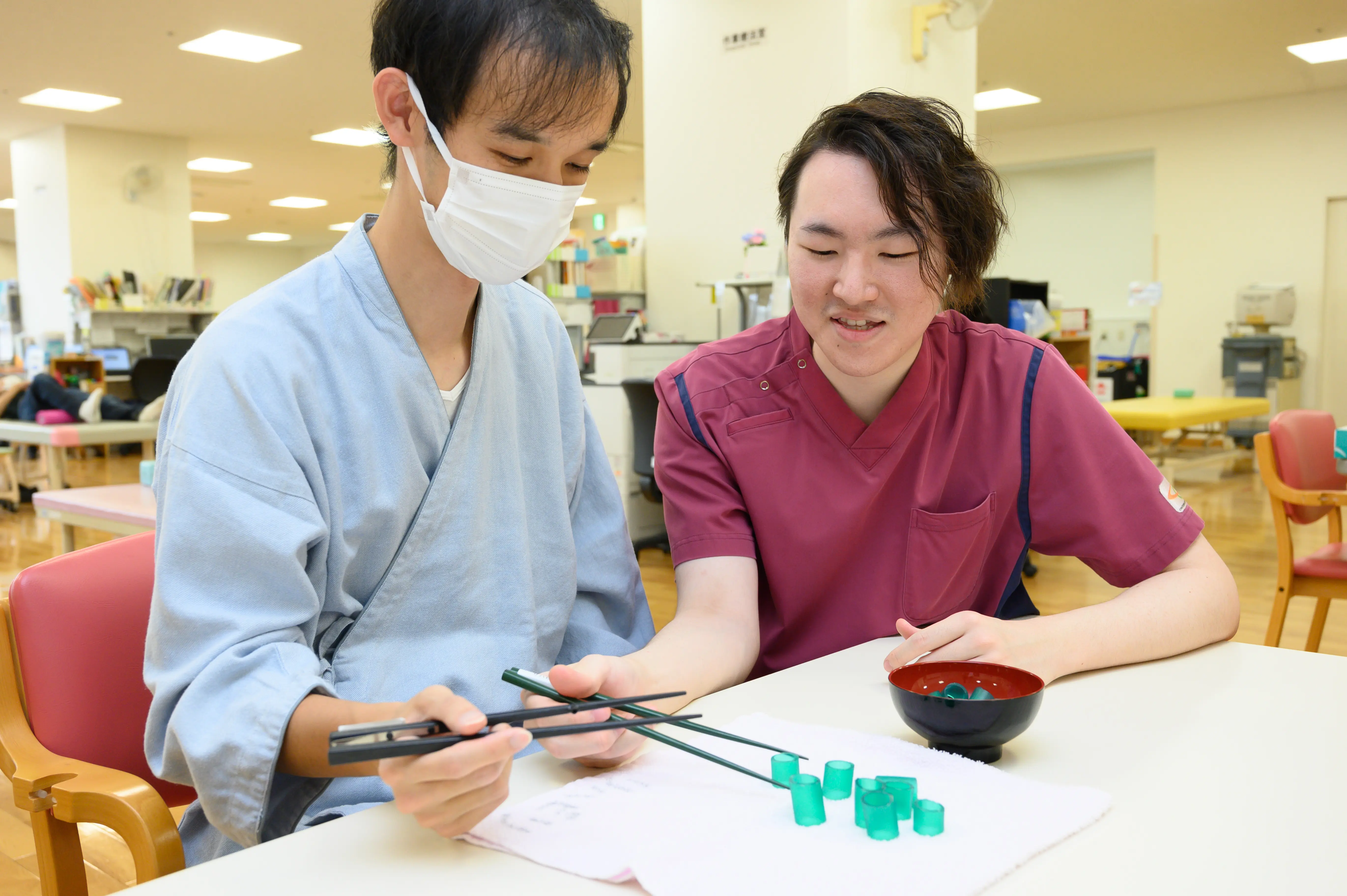 現状だと、高次脳機能障害の分野が気になっていていますね。意識や言語など、さまざまな障害が複雑に絡んでいく中で「どうすれば患者さんの生活をサポートできるか?」を考えるのが好きなんです。「このリハビリとこのリハビリを組み合わせてみるのはどうか?」とか「オリジナルの自助具を作ってみよう」とか。そういった試行錯誤の中で、患者さんと伴走しながらリハビリに取り組んでいき、回復・改善の喜びを共有していけたらと思います。