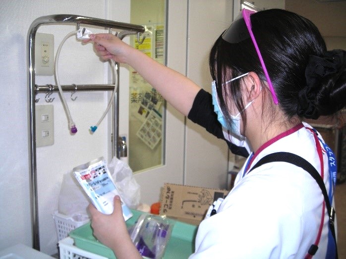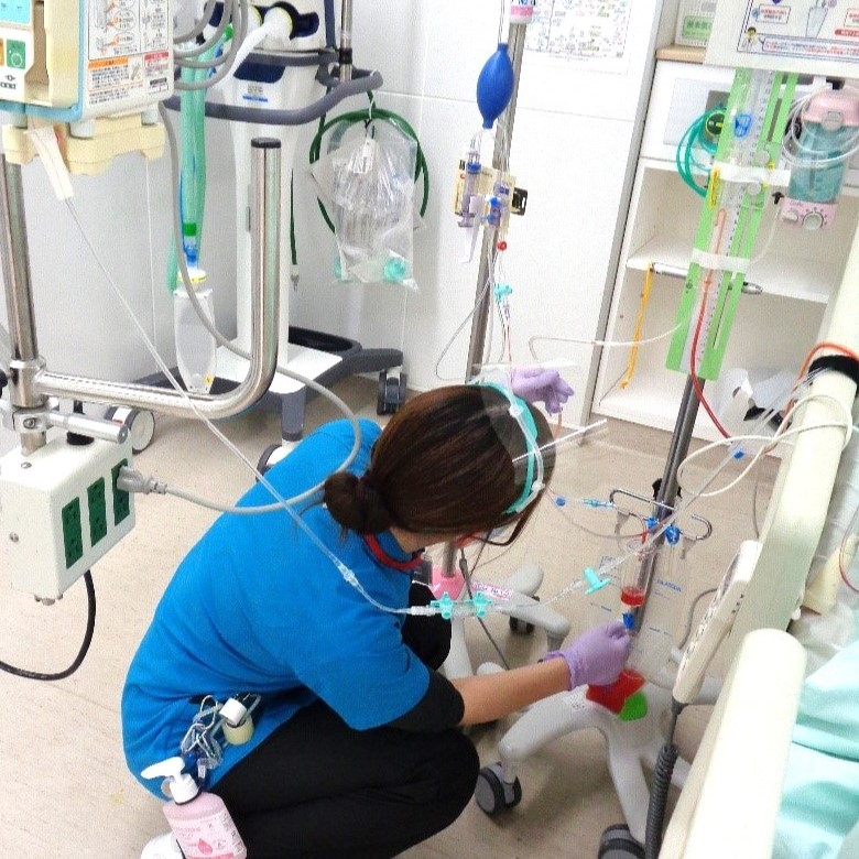 ① さまざまな医療機器の管理方法や観察項目を理解することに取り組んでいます。