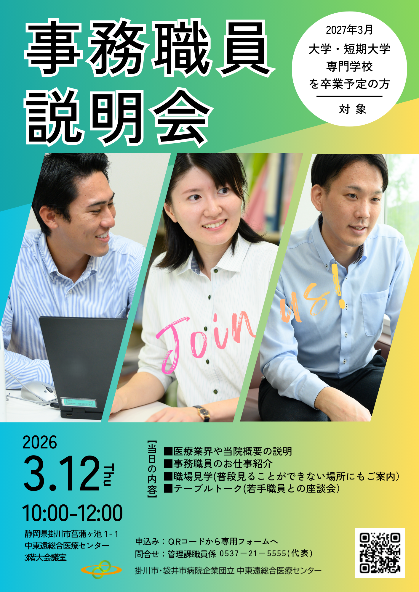 就職説明会 2027年新卒対象事務職員就職説明会を開催します 2026年3月12日(木)に、2027年3月大学・短期大学・専門学校を卒業予定の方を対象とした事務職員就職説明会を開催します。 参加ご希望の方は、申込フォームからお申込みください。 申込フォーム https://req.qubo.jp/chutoen-hp/form/jimusetsumeikai