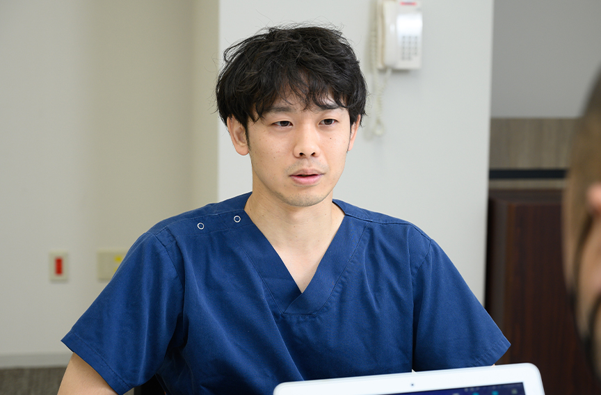 私が考える医師としてのモットーは「患者さんのためにどうするか? 何をするか?」です。3年目以降は自分が主治医となり、患者さんを診察し、自分の判断で治療法などを選択していきます。知識や経験の不足により未熟な部分も出てくるのですが、そんな中でも「目の前の患者さんのために」を第一に考え、そのための勉強だったり情報収集にしっかり時間を割くことが重要だと考えるようになりました。自分が成長することで、患者さんのためになる。自分が勉強することで、患者さんに還元できる。そういった気持ちで日々の診療にあたることができるようになってきましたね。これからも、目の前にある検査データだけで判断するのではなく、患者さんの声に耳を傾けたり、心理的な部分へのアプローチまでできるような「患者さん全体を診ることができる」医師を目指して努力していきたいです。